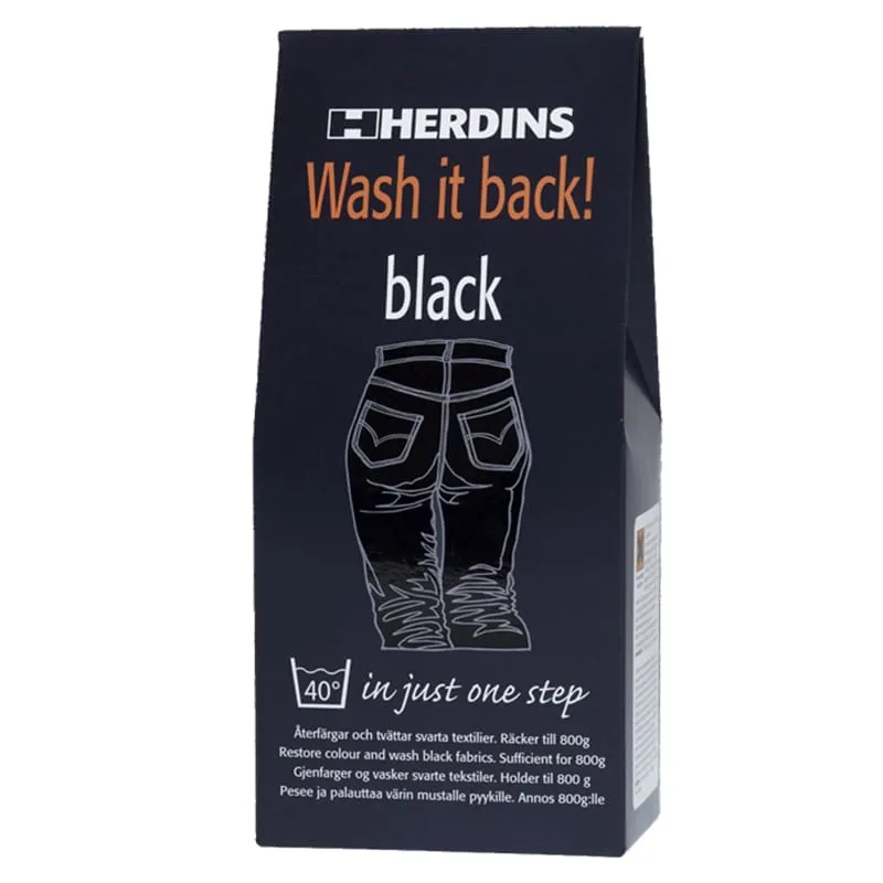 Börjar dina stackars kläder tappa sin svarta färg? Då hjälper Herdins Wash it Back Black dig! Dina svarta kläder återfärgas och tvättas på ett väldigt enkelt sätt. In med kläder av bomull, viskos eller lin i tvättmaskinen och addera Wash it Back Black. Tvätta sedan som vanligt.