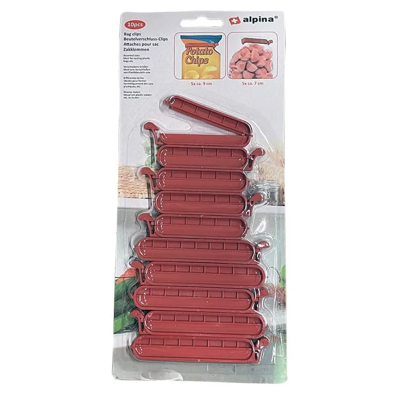 Dessa röda påsförslutare i två storlekar är toppen för att hålla plastpåsar stängda så du slipper dålig lukt i kylen. Setet innehåller totalt tio påsklämmor, fem med en längd på sju centimeter och fem med en längd på nio centimeter.