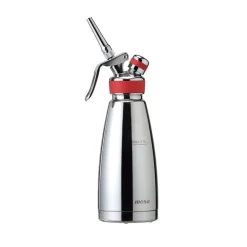 En professionell gräddsifon med dubbel vägg som kan användas både för varma och kalla krämer och håller temperaturen i timmar. Fungerar med kapslar (N₂O). Rostfritt stål. Tål diskmaskin. Tre spritsmunstycken och en borste medföljer. Höjd 28 cm.