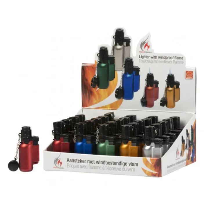 Detta är så kallade Turbotändare som är både snygga och lätta att bära med sig. Tändarna kommer osorterade och finns i flera trevliga metallicfärger. För att fylla på tändaren när den är slut behöver du .