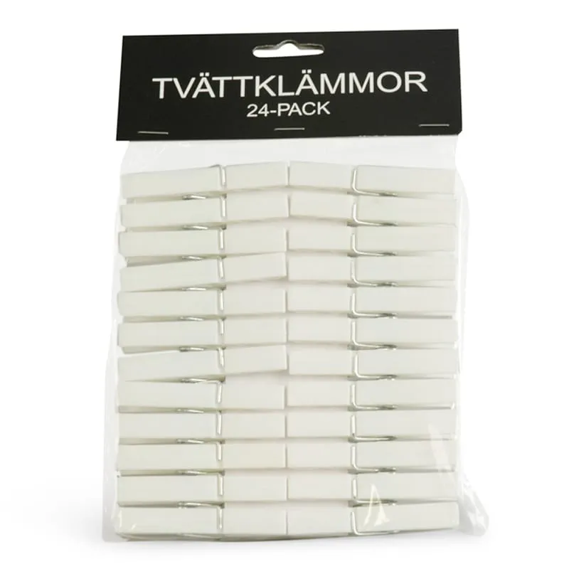Detta 24-pack innehåller helt vanliga tvättklämmor, eller klädnypor om du så vill. Tvättklämmorna är vita, tillverkade i plast och har standardstorlek. Inga konstigheter!
